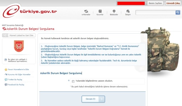 Veya doğrudan https://www.turkiye.gov.tr/askerlik-durum-belgesi-sorgulama bu linke tıklayarak başlığı bulabilirsiniz. Ekranda yer alan “Yukarıdaki bilgilendirme yazısını okudum, anladım ve kabul ediyorum” seçeneğini işaretledikten sonra “DEVAM ET” butonuna tıklayınız.