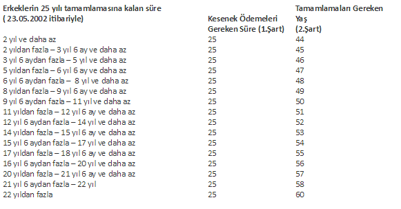 1.05.2008 tarihinden sonra işe başlayan erkeklerde 9000 prim gününü tamamlamaları gerekmektedir. 9000 prim günün 31.12.2005 tarihine kadar tamamlayan erkekler 60 yaşında emekli olabilmektedirler. Bunun dışındaki emeklilik şartları: