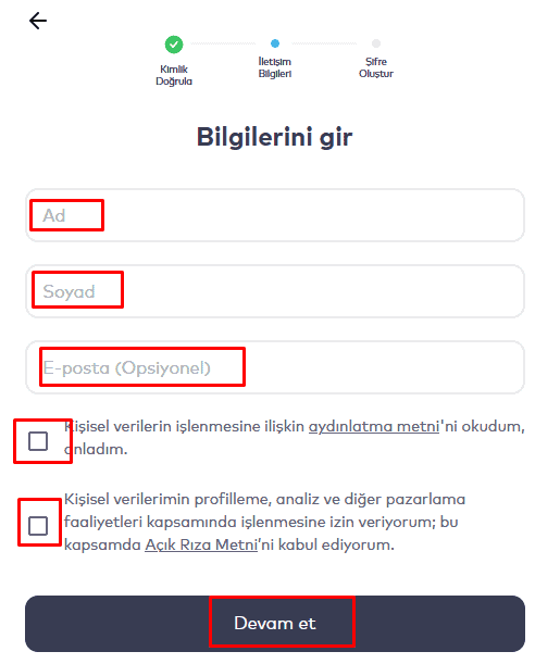 Ad, soyad ve e-posta bilgileri girildikten sonra belirtilen kutucuklar işaretlenmelidir. Sonra tekrar “Devam Et” yazan kısma tıklamalısınız.