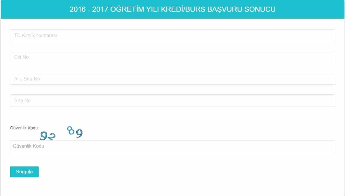 Bu durumda karşınıza böyle bir ekran gelecektir. Görselde de görebileceğiniz gibi yapmanız gereken şey T. C. kimlik numaranızı, cilt numaranızı, aile sıra numaranızı ve sıra numaranızı girmektir. Sonrasında hemen altta bulunan güvenlik kodunu doğru bir şekilde yazarak “Sorgula” butonuna basmanız Kyk burs sonuçlarınızın görüntülenmesi için yeterli olacaktır.