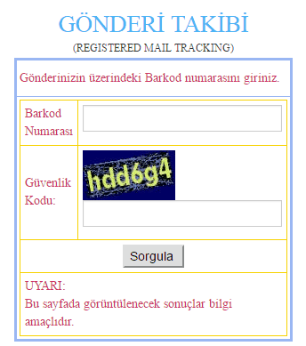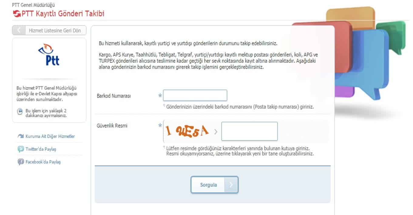 Karşınıza gelecek olan liste yukarıda yer alan görselde gözükmektedir. Kırmızı ok ile işaretli olan “PTT Kayıtlı Gönderi Takibi” seçeneğine tıkladığınız takdirde karşınıza aşağıda yer alan görsel gibi bir bölüm gelecektir. Bu aşamada barkod numarası ve güvenlik kodunu girerek alt kısımda yer alan “Sorgula” düğmesine tıklayabilir ve dosyalarımızın nerede olduğunu öğrenebiliriz.