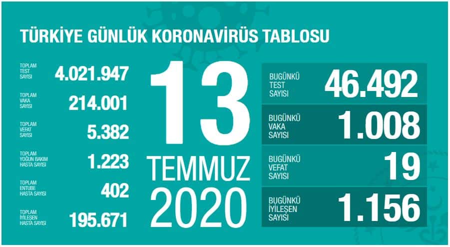 13 Temmuz 2020 Koronavirüs Güncel Verileri, Sağlık Bakanı Fahrettin Koca, tarafından paylaşılan güncel veri tablosu şu şekilde olmaktadır.