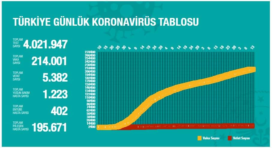 • Bu güne kadar Türkiye genelinde tespit edilen korona virüs vaka sayısı; 214 bin bir kişi,
