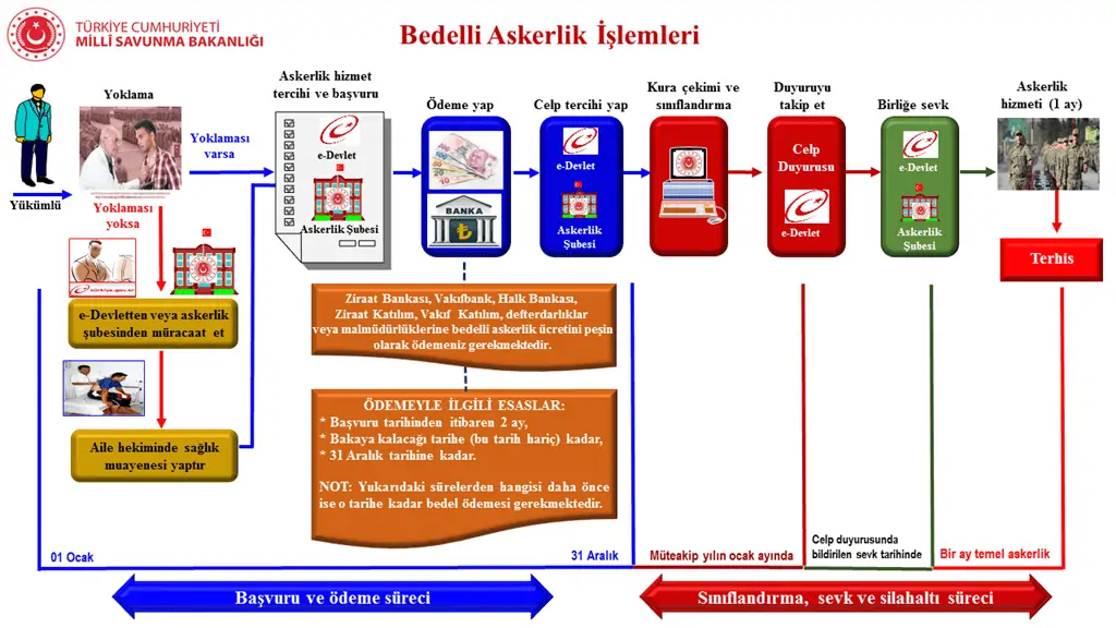 Bedelli askerlik hizmetinden faydalanma süreci, şartlar, başvuru esasları, celp ve sevk dönemi, hizmet kapsamından çıkarılma işlemleri, geri ödeme işlemleri ve hizmet kapsamına giren izin işlemleri hakkında güncel verilerde değişiklik olabilir.
