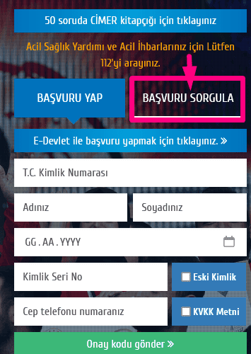 Yukarıdaki bilgileri girdikten sonra “Onay Kodu Gönder” yazan yere tıklamalısınız. Cimer başvuru sorgulama için telefonunuza bir onay kodu gönderilir. Onay kodunu girdikten sonra işlemlerinize başlayabilirsiniz.