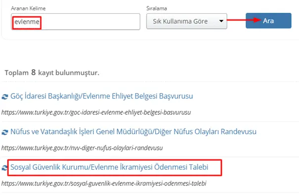 3. Ana sayfadaki arama ekranına ‘’evlilik yardımı’’ yazınız.