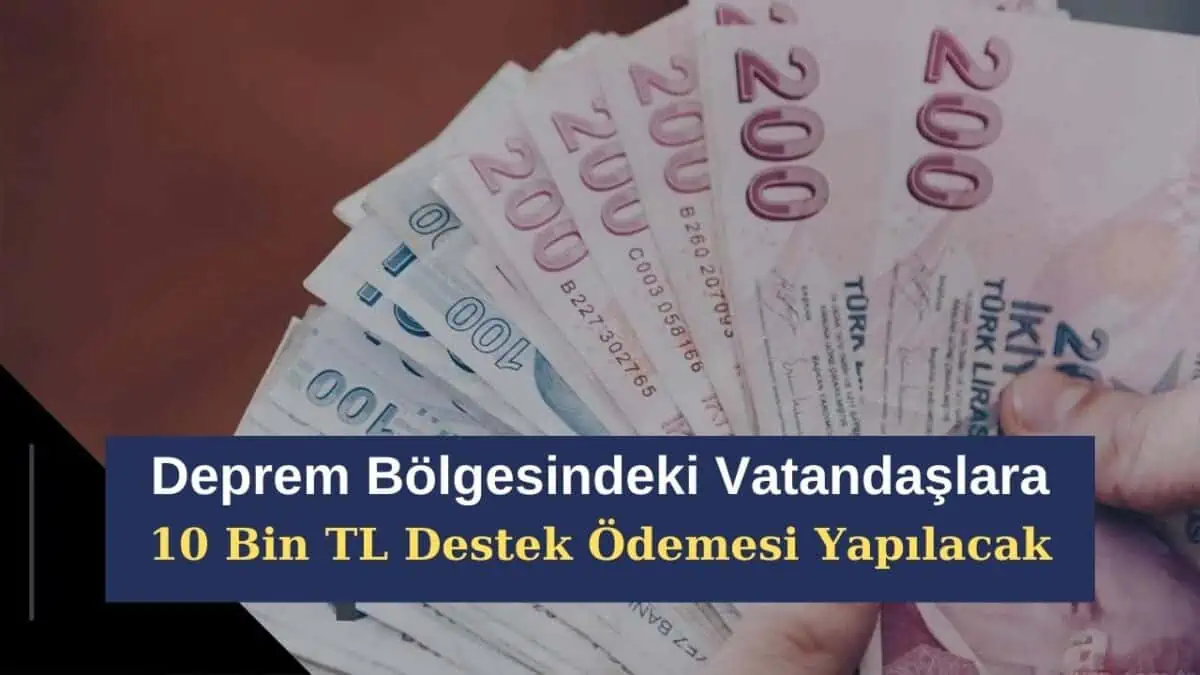 Kahramanmaraş, Adana, Hatay, Şanlıurfa, Gaziantep, Kilis, Osmaniye, Adıyaman, Diyarbakır ve Malatya’da ağır hasarlara ve çok sayıda can kaybına neden olan deprem sonrasında Cumhurbaşkanı Erdoğan tarafından deprem bölgesindeki vatandaşlar için 10 bin TL destek ödemesi yapılacağı aktarılmıştır. Deprem destek ödemelerinin ne zaman yapılacağı konusunda ise henüz net bir açıklama bulunmuyor. Hazine ve Maliye Bakanlığı tarafından yapılacak çalışma sonrasında ilgili vatandaşlara söz konusu ödemelerin verilmesi hedefleniyor.