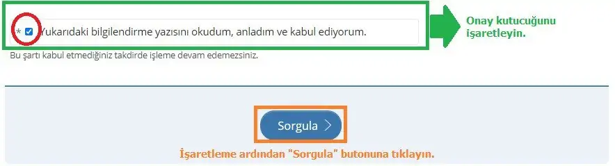 Açılan sayfada barkodlu belge oluşturmak için onay metnini okumanız ve onayladığınızı belirten işaretlemeyi yapmanız gereklidir. Aşağıda gösterildiği şekilde onay kutucuğunu işaretleyin ve “Sorgula” butonuna tıklanarak belge oluşturulur.