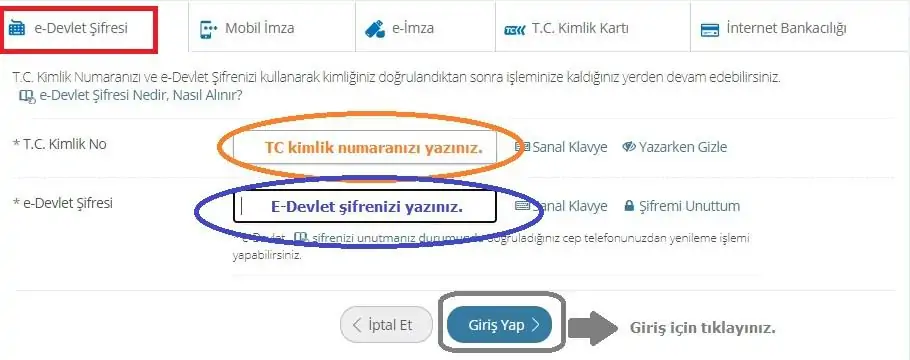 Görselde kırmızı çerçeve içine alınan “e-Devlet Şifresi” sekmesine tıklayarak, ilgili alanlara “TC kimlik numarası” ve “e-Devlet şifresi” bilgilerini girerek “Giriş Yap” butonuna tıklayın.