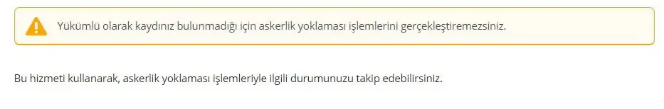 Askerlik yoklama başvurunuzu yaptırmamanız halinde, görüntüleme işlemleriniz başarısız olacaktır. Yoklama başvurusu yapılmadan ilgili hizmet kullanıldığında karşılaşılan ekran görüntüsü aşağıda gösterilmektedir.