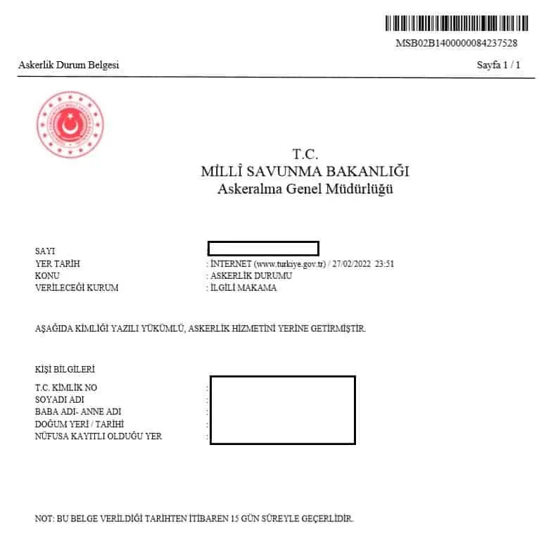 Yukarıda anlatıldığı şekilde yapılan sorgulama ardından, 15 gün geçerliliğe sahip askerlik durum belgesine sahip olabilirsiniz. Sorgulama sonrası size verilecek barkodlu belgenin örneği aşağıda paylaşılan görsel ile aktarılmıştır. Herhangi bir kurum için talep edilen askerlik durum belgesini e-Devlet’ten barkodlu olarak üreterek çıktı alabilirsiniz.
