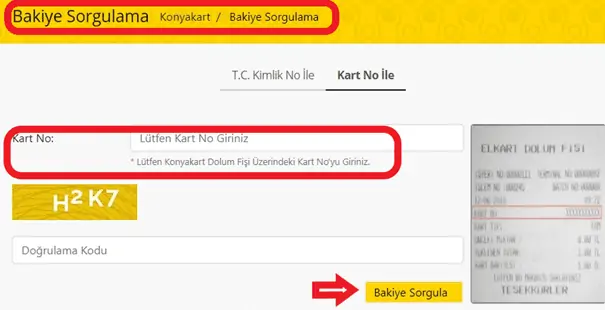 Kart ile sorgulama yapmak için kart numaranızı bilmeniz gerekir. Kart numaranız kart dolum fişi üzerinde de yazar.
