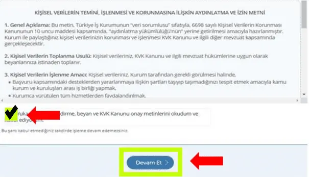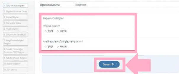 Başvuru ekranında size emekli olup olmadığınız sorulur. Aynı zamanda üzerinizde iş yeri olup olmadığı da sorulan sorular arasındadır. Bu bilgileri girdikten sonra kişisel verilerin korunmasına ilişkin metni onaylamalısınız.
