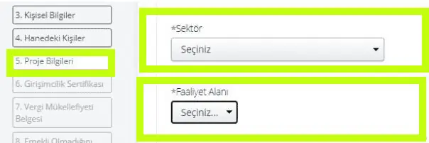 Yukarıdaki alanda projenin gerçekleştirileceği sektör seçilmelidir. Ardından faaliyet alanı da açılan listeden seçilir. Tüm seçimlerin doğru yapılmasına dikkat edilmelidir.