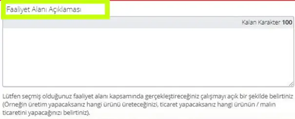 Faaliyet alanı kısmında yapılmak istenen işe ilişkin detaylar açıklanmalıdır. Yapılacak işe göre açıklamada tüm bilgiler yer almalıdır.