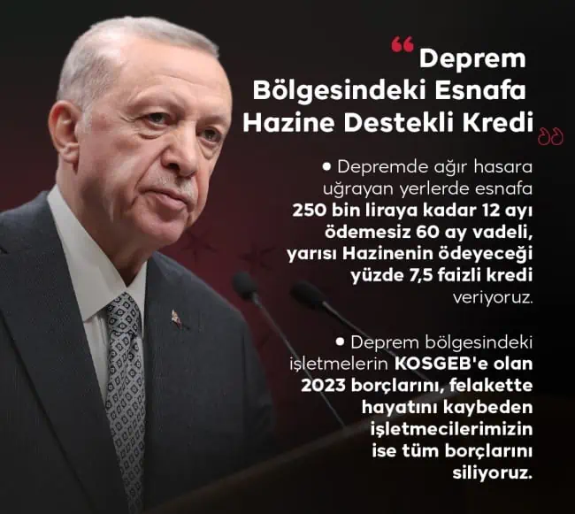 Yapılan kabine toplantısının ardından Cumhurbaşkanı Recep Tayyip Erdoğan açıklamalarda bulundu. Erdoğan, 10 ili etkileyen Kahramanmaraş merkezli deprem felaketinde ağır hasar gören yerler için esnafa 250 bin TL’ye kadar kredi sağlanacağını açıkladı. Bu desteklerde, ilk 12 ay ödemesiz olacak 60 ay vadeli ve yarısı Hazine’nin ödeyeceği olmak üzere yüzde 7,5 faiz oranı düzenlenecek.