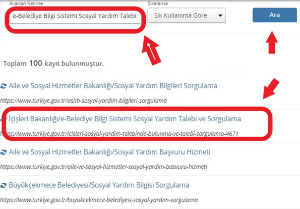 E-Devlet’e girdikten sonra arama alanına “e-Belediye Bilgi Sistemi Sosyal Yardım talebi” yazarak yönlendirme ekranına ulaşabilirsiniz.