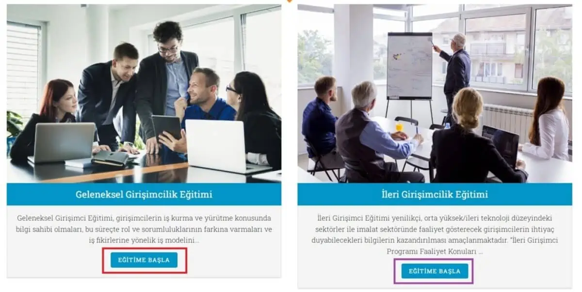 - Yönlendirme yapılan sayfada aşağıda gösterildiği şekilde devam etmek istediğiniz eğitimin altında yer alan “Eğitime Başla” butonuna tıklayarak eğitim başvurusunu tamamlayın.