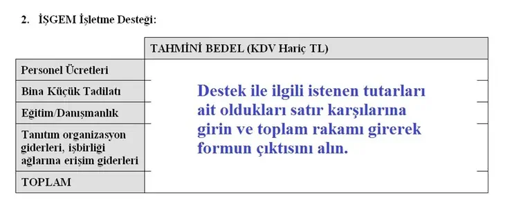 - Son sayfada yer alan ve aşağıda gösterilen destek ile ilgili tutarları istenen bölümlere girin ve formun çıktısını alarak imzalayın.