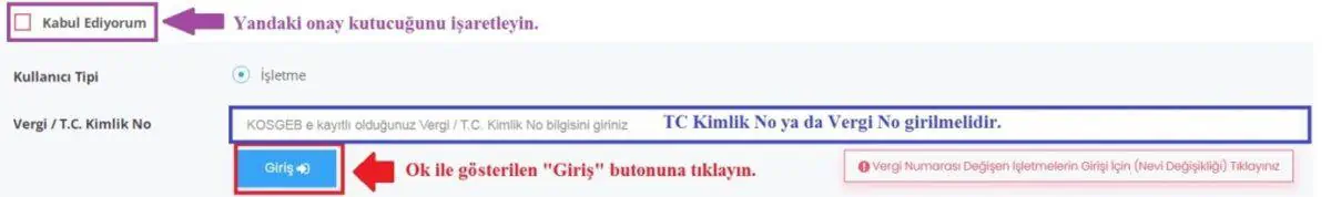 Açılan sayfada 6 maddelik bilgilendirme metnini okuyun ve bilgilendirmenin hemen altında yer alan “Kabul Ediyorum” onay kutucuğunu seçin. Seçimin sonrası KOSGEB’e kayıtlı olduğunuz TC kimlik numarası veya vergi numarasını yazarak “Giriş” butonuna tıklayın.