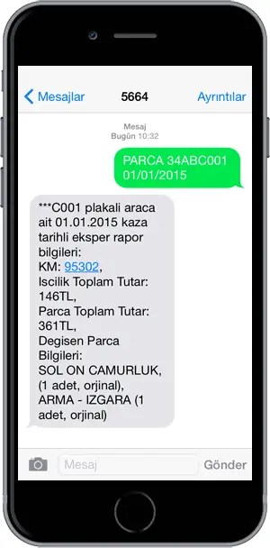 Aracın değişen parçalarını SMS ile sorgulamak için PARCA yazıp boşluk bırakın, plakayı yazıp boşluk bırakın, kaza tarihini yazınız 5664’e mesaj gönderiniz.
