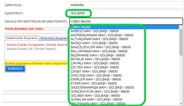 Ankara posta kodu sorgulama işlemlerinde İl sütunundan “Ankara” seçilmelidir. Ardından ilçe belirlenmelidir. İlçe seçimini yaptığınızda tüm mahalleler otomatik olarak karşınıza çıkar. Mahallelerin yanında posta kodu da yazar. Bu sayede tekrar sorgulama yapmadan posta kodunu öğrenebilirsiniz.