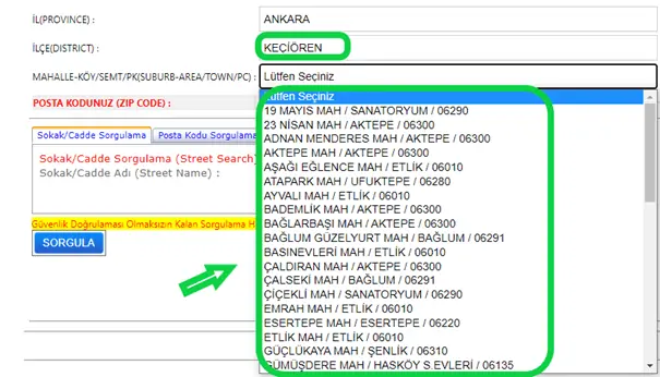 Yukarıda gösterilen kısımdan ise sokak-cadde sorgulama yapabilirsiniz. Bu kısımdan posta kodunu yazarak nereye ait olduğunu görebilir ve kurum sorgulama işlemini gerçekleştirebilirsiniz.