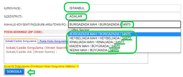İl tercihini İstanbul; ilçe tercihini “Adalar” yaptıktan sonra mahalle seçenekleri karşınıza çıkar. Bu seçenekler arasından uygun olanı tercih ettiğinizde posta kodunuz ekranda görünür. Mahallelerin posta kodları açılan listede mahalle adlarının yanında yazmaktadır.