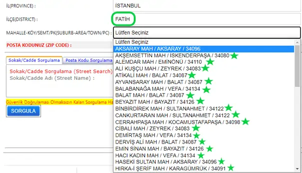İstanbul Fatih posta kodu sorgulama için İstanbul olarak il seçimini yaptıktan sonra ilçeyi Fatih olarak ayarlamalısınız.