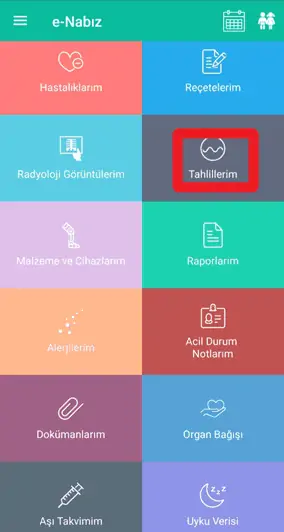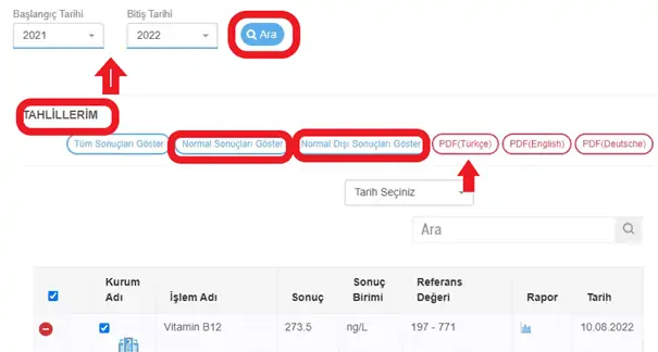 - “Tahlil Sonuçları” veya “Laboratuvar” sekmesi seçilir.