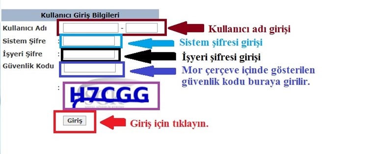 • Açılan ekranda aşağıda gösterildiği gibi ilgili alanlara “Kullanıcı adı, sistem şifresi, işyeri şifresi, güvenlik kodu” bilgilerini girmeniz ve sonrasında “Giriş” butonuna tıklamanız sorgulama için yeterlidir.