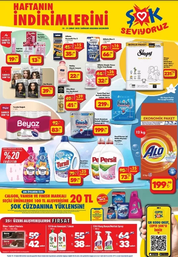 Türkiye’nin önde gelen zincir marketlerinden biri olan Şok her hafta olduğu gibi 15 -21 Şubat tarihlerinde de bu haftanın büyük indirim fırsatlarını duyurdu. Temel gıda ürünlerinden hijyen ve temizlik ürünlerine kadar birçok farklı üründe cazip indirimler uygulanacak. Söz konusu indirimlerden yararlanarak vatandaşların birçok ihtiyacını rahatça karşılamaları hedefleniyor.