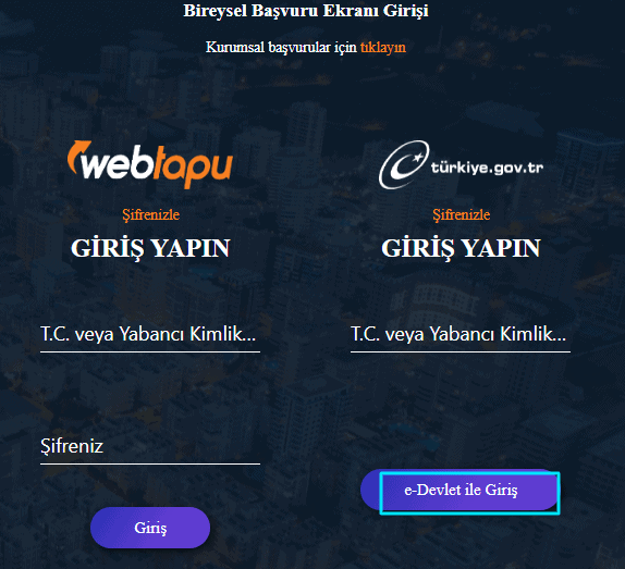• Bu kısımda Web Tapu ile giriş yapılabilir. Aynı zamanda e-Devlet şifresi kullanılarak de giriş yapılabilir. Böylece sisteme erişmek daha kolay olur.